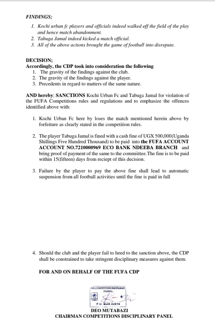 In a document signed by the Chairman of FUFA Competitions and Disciplinary Committee, Deo Mutabazi, Kochi Urban lost the match by forfeiture.