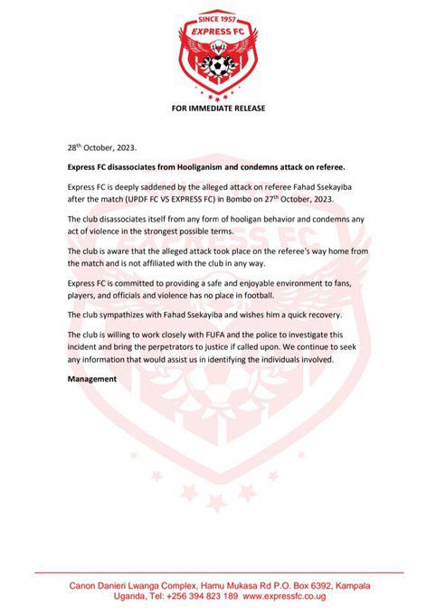 "The FUFA Executive Committee has suspended all matches involving Express FC with immediate effect until an amicable solution on the safety and security of referees is found following ugly scenes of their Uganda Premier League match against UPDF," FUFA said in a statement.