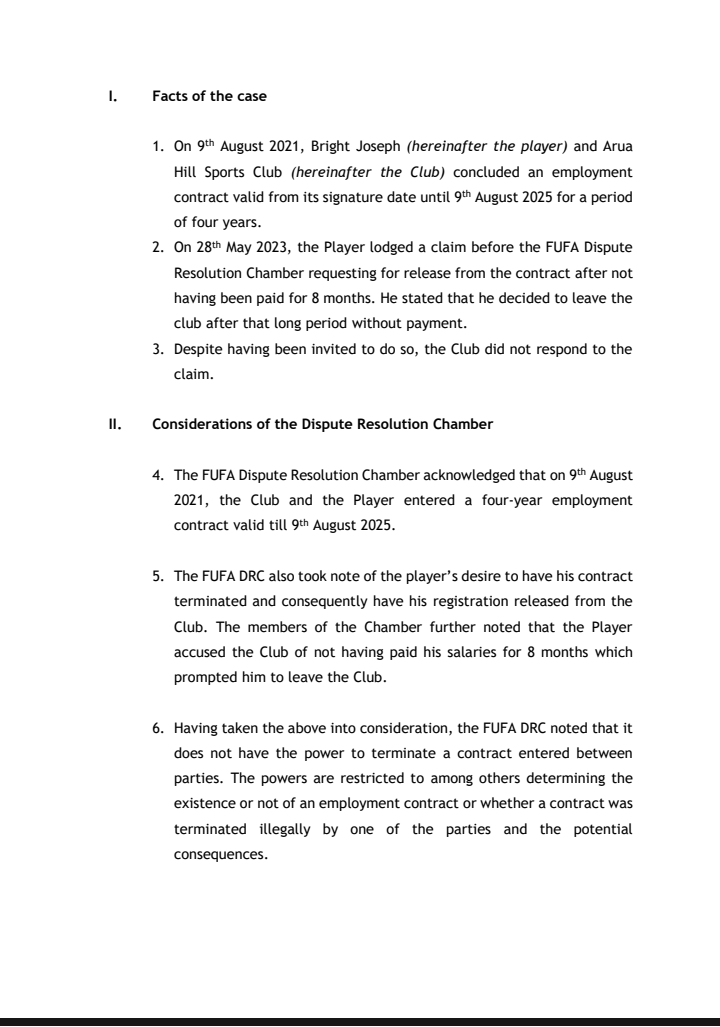 Part of the document regarding Vuni's contract dispute with Arua Hill SC. Courtesy