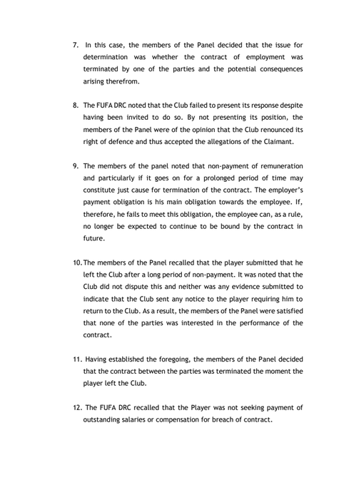 “It was noted that the club did not dispute this (non-payment of salaries) and neither was any evidence submitted to indicate that the club sent any notice to the player requiring him to return to the club.”
