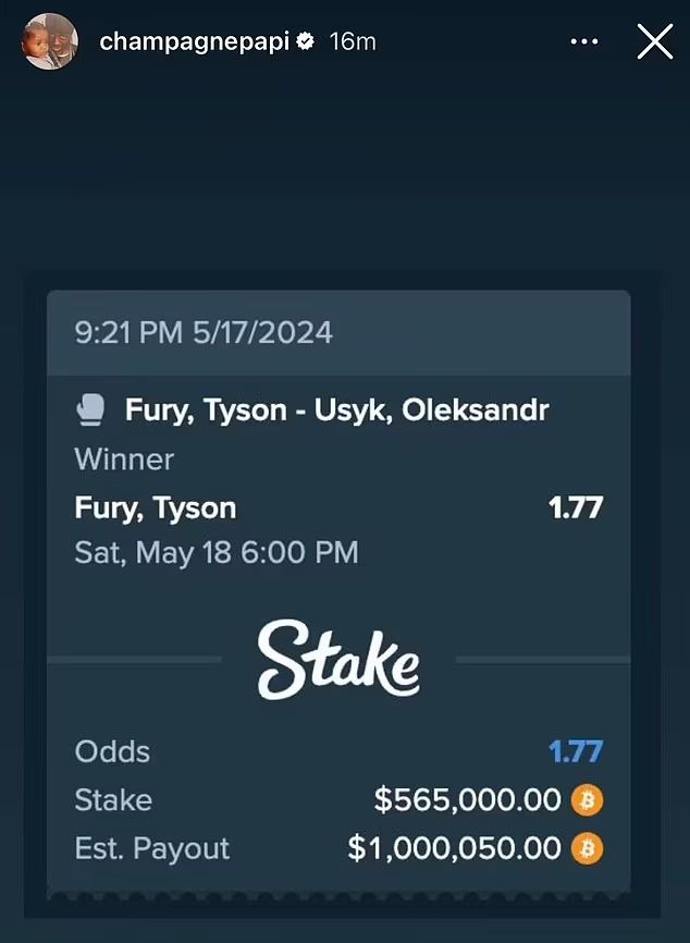 According to Daily Mail, Drake disclosed to his 146 million followers that he has invested a whooping £462,396 ($565,000) on 'The Gipsy King' Fury, with the potential to win an incredible £789,608 ($1m).