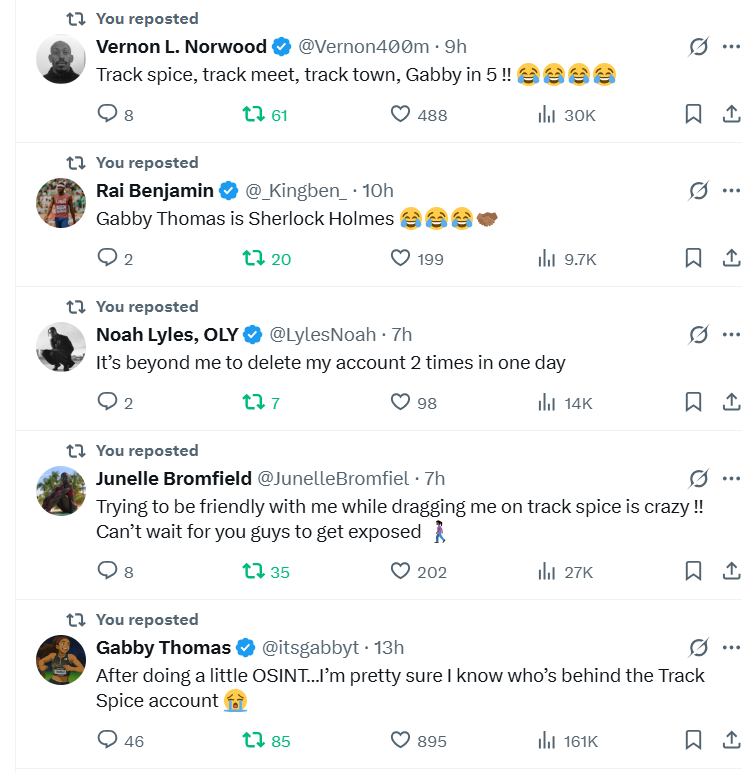 “Track spice, track meet, track town, Gabby in 5,” multiple Olympics and world 4x100m champion Vernon Norwood also weighed.