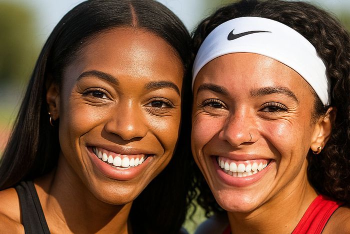 Gabby Thomas and Tara Davis-Woodhall share a joyful moment ahead of the 2025 Athlos meet, where both will compete.