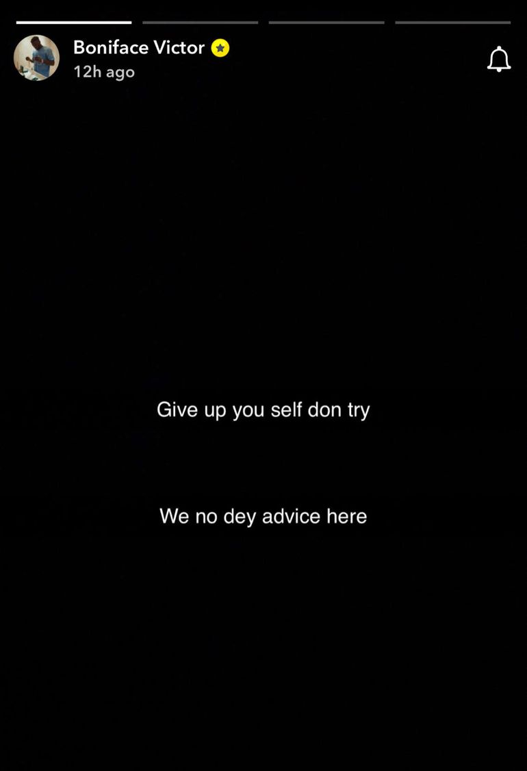 Posting on his official Snapchat, Boniface wrote: “Give up, you sef don try. We no dey advice for here.”