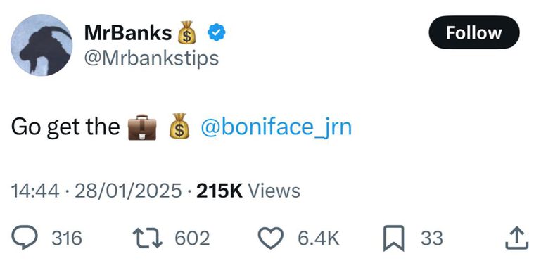 “Go get the money/bag @victorboniface,” Mr Banks, who was named the no.1 most influential Nigerian punter by Pulse Sports for a second consecutive year, tweeted to his 1.5 million followers.