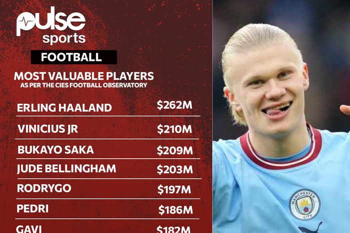 Manchester City and Premier League top scorer Erling Haaland heads the list of the world’s most valuable players with a value of almost €250 million (eventual buy-out clause not considered).