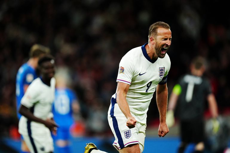 Harry Kane celebrates scoring for England on his 100th appearance on September 10, 2024 (Credit: Imago)