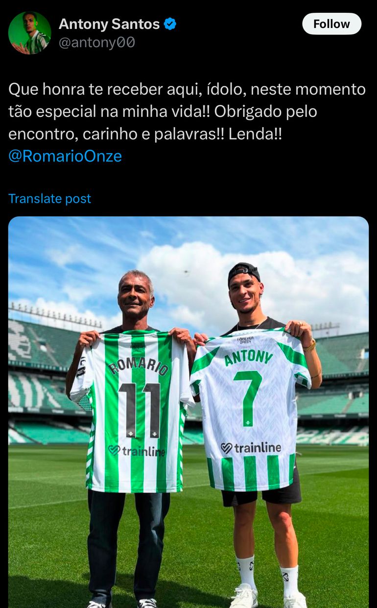 Antony expressed his admiration for Romário on social media, tweeting: "What an honour to have you here, idol, at this special moment in my life!! Thank you for the meeting, affection and words!! Legend!! @RomarioOnze."