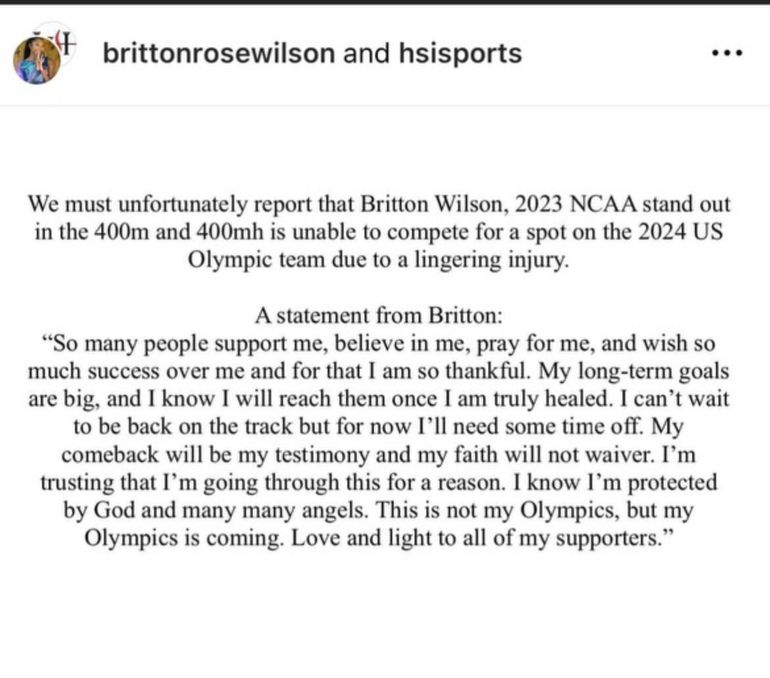 Wilson's agent shared the news that the 2023 U.S. Championships 400m runner-up will miss the trials due to a lingering injury.