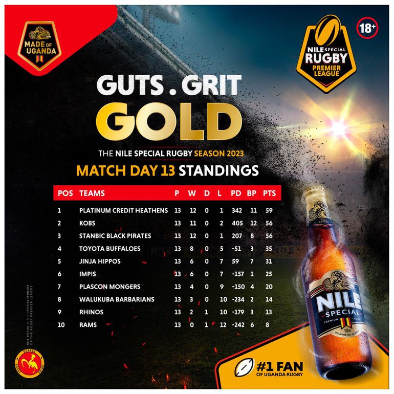 Week 13 of the Nile Special Rugby Premier League ended with changes to the table, most significantly at the top.