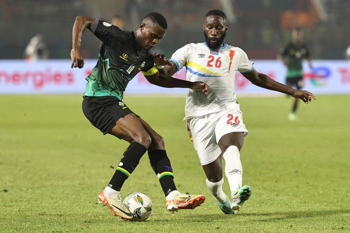 Nahodha wa Taifa Stars, Mbwana Samatta (kushoto), akimpiga chenga Arthur Masauku wa DR Congo