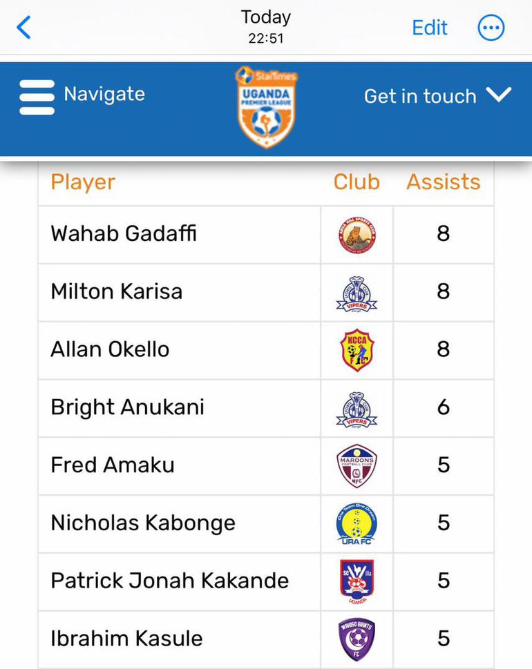 He was in the category of players with the most assists, and before Thursday, the Uganda Premier League website indicated that he had the most assists.