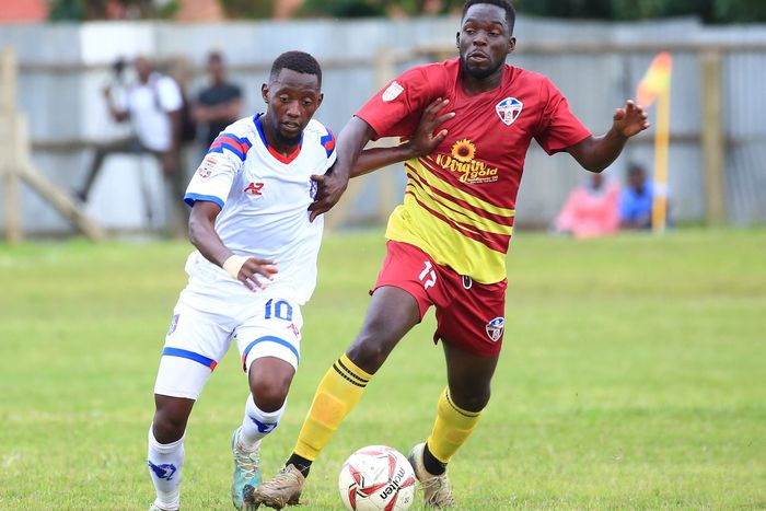 Villa's Umar Lutalo (left) vies for the ball with Maroons FC's Walusimbi Solomon (right).