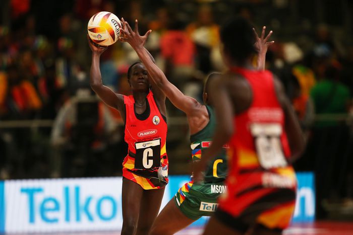 Shadiah Nassanga attempts to throw a pass during her impressive player of the match performance against Malawi in their Netball World Cup encounter