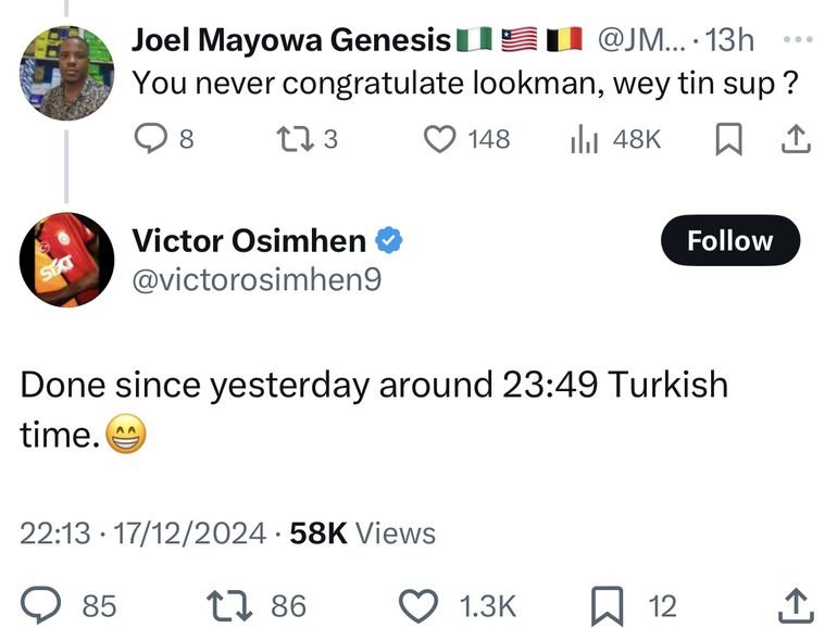 “You never congratulate Lookman, wey tin sup?”