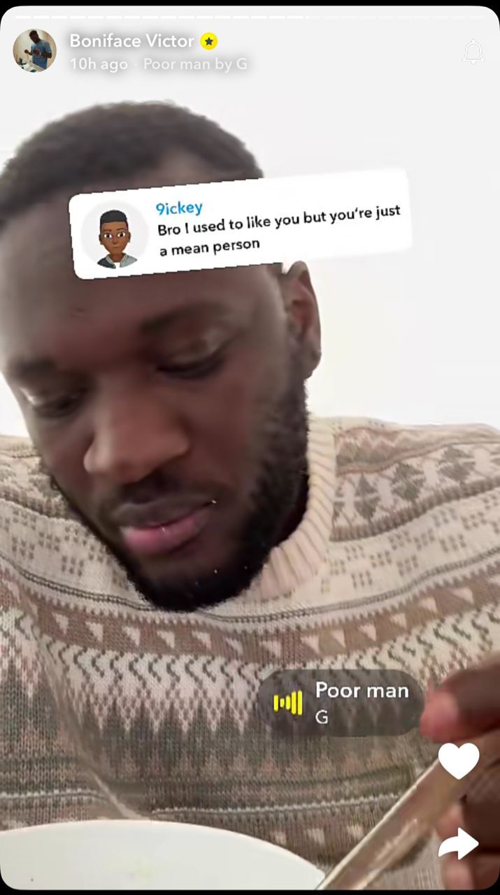 In true Boniface fashion, the Super Eagles striker took to Snapchat to call out the negativity after a fan slid into his inbox to say: “Bro I used to like you but you're just a mean person.”