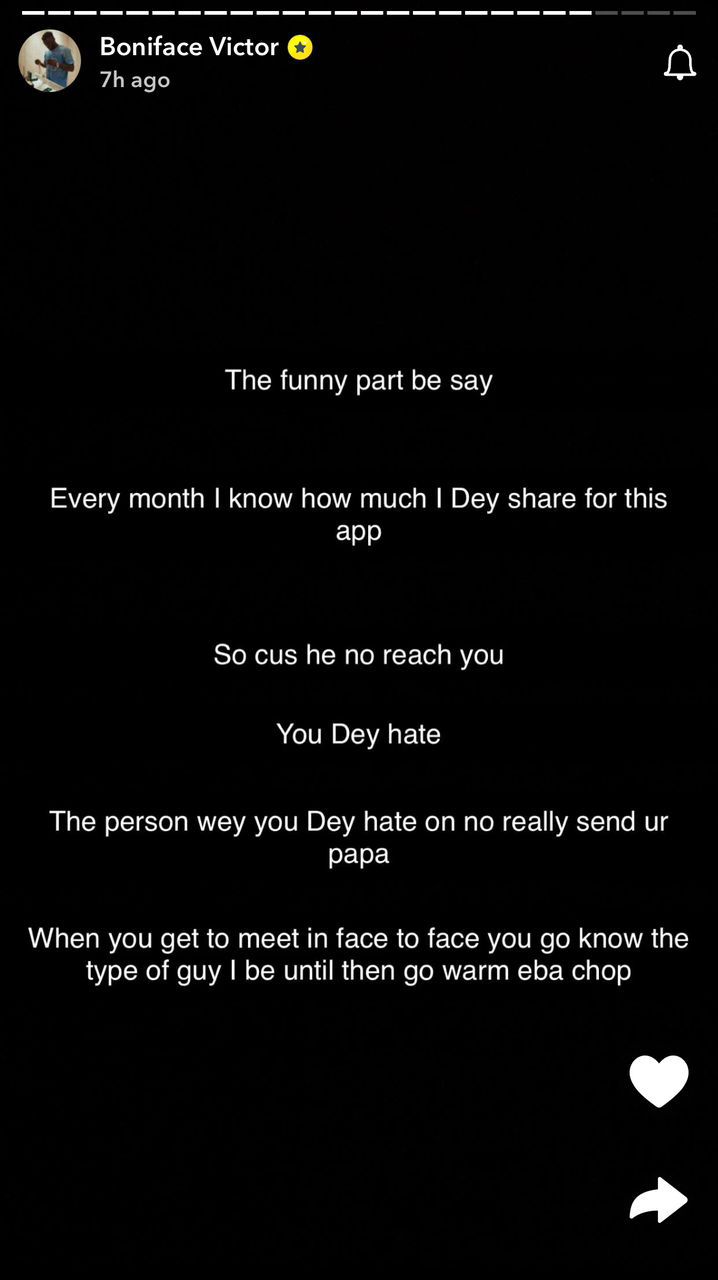 “The funny part be say, every month I know how much I dey share for this app. So cus he no reach you, you dey hate. The person wey you dey hate on no really send ur papa. When you get to meet in face to face you go know the type of guy I be…until then go warm eba chop.”
