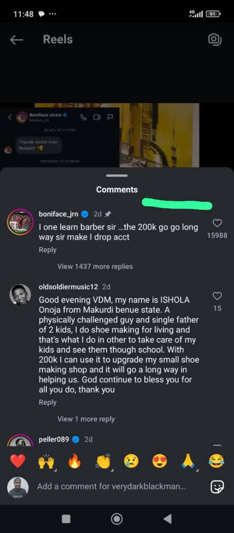Boniface publicly made the funny appeal to Verydarkman stating that the N200,000 will be used to fund a saloon business.