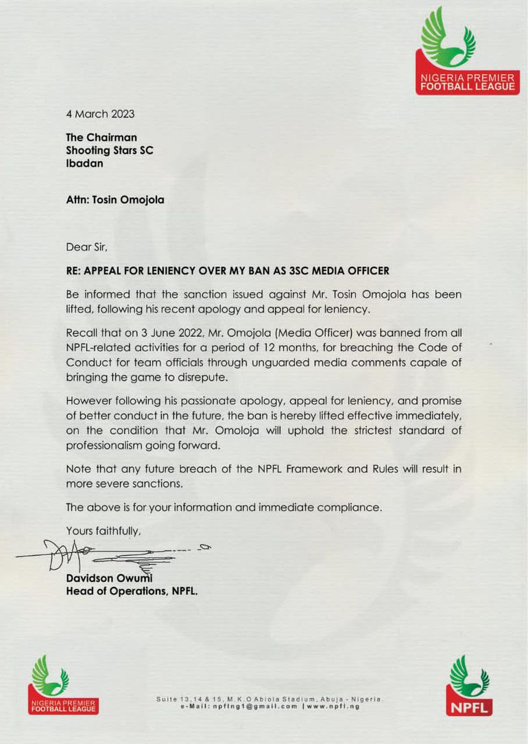 "Recall that on 3 June 2022, Mr. Omojola (Media Officer) was banned from all NPFL-related activities for a period of 12 months, for breaching the Code of Conduct for team officials through unguarded media comments capale of bringing the game to disrepute.