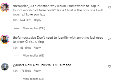 "As a christian why would I somewhere to “tap in” to idol worship of false Gods? Jesus Christ is the only one I will worship! Love you Izzy."