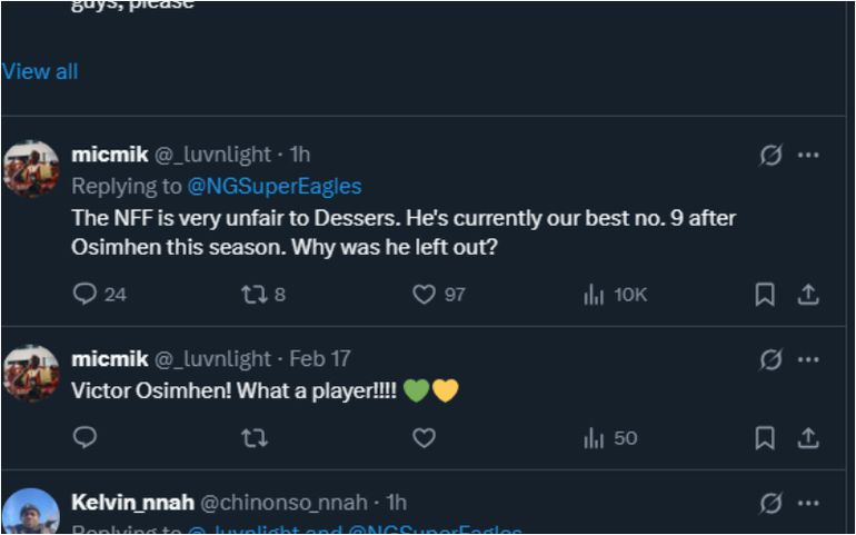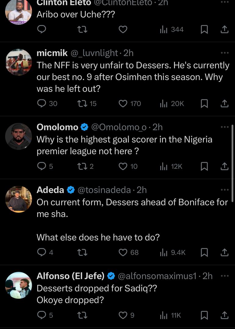 One fan said, "The NFF is very unfair to Dessers. He's currently our best no. 9 after Osimhen this season. Why was he left out?"