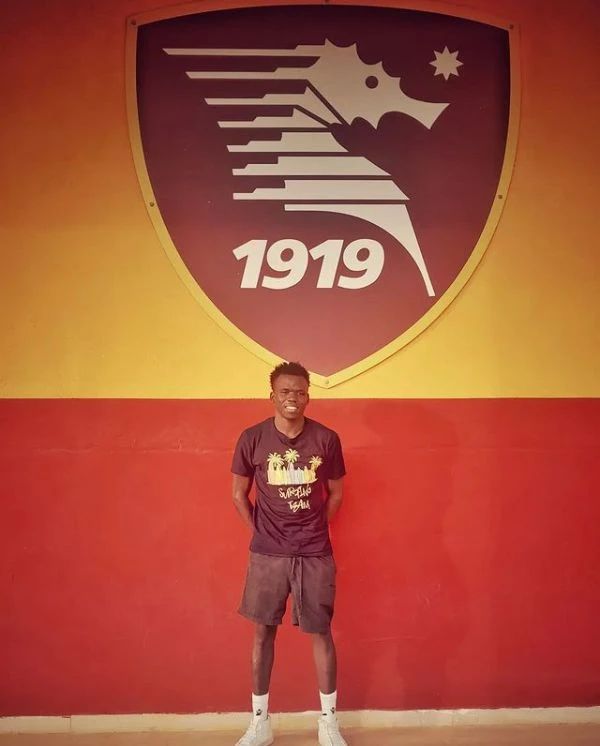 Mawa poses for a photo at US Salernitana1919 with the club crest in the background. Courtesy