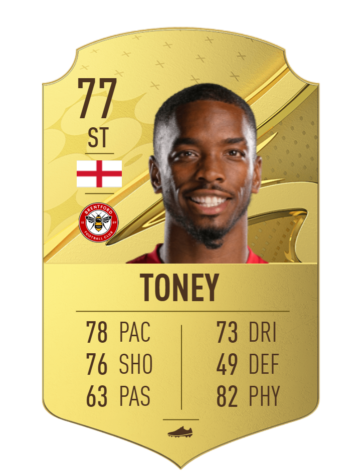 Ivan Toney is currently rated 77 on FIFA 23 with a potential OVR of 81.