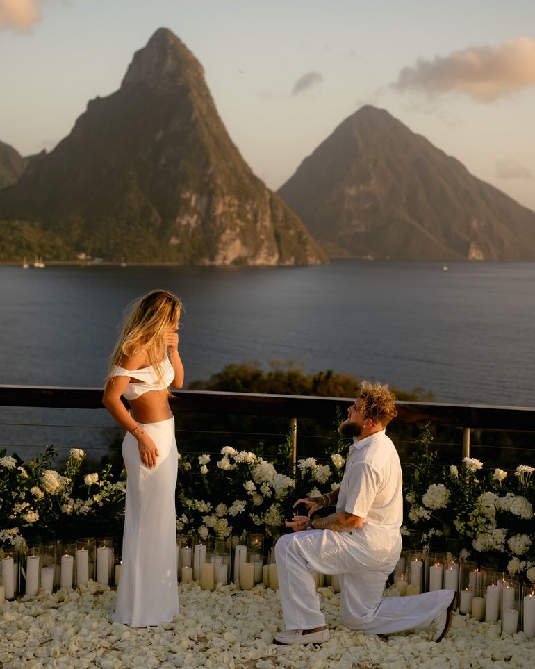 The proposal, captured in a breathtaking photograph, unfolded against the dramatic backdrop of St. Lucia’s iconic Piton mountains.