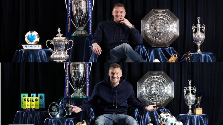 Vardy was photographed holding the Premier League trophy, the FA Cup, the Community Shield, and the EFL Championship trophy, symbolizing the monumental achievements of his Leicester career.