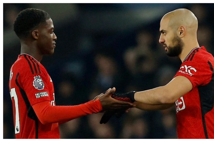 Sofyan Amrabat and Kobbie Mainoo in action for Manchester United. Credit: @drayy09/ Twitter