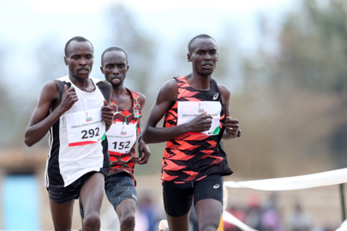 Silas Sentura (R) at previous leg of Athletics Kenya Cross-Country meet. (Credit Athletics Kenya).