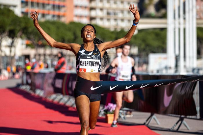 By the time she reached 2,000m in 5:29.38 – inside world record pace – she had a seven-second lead over Chepkoech.