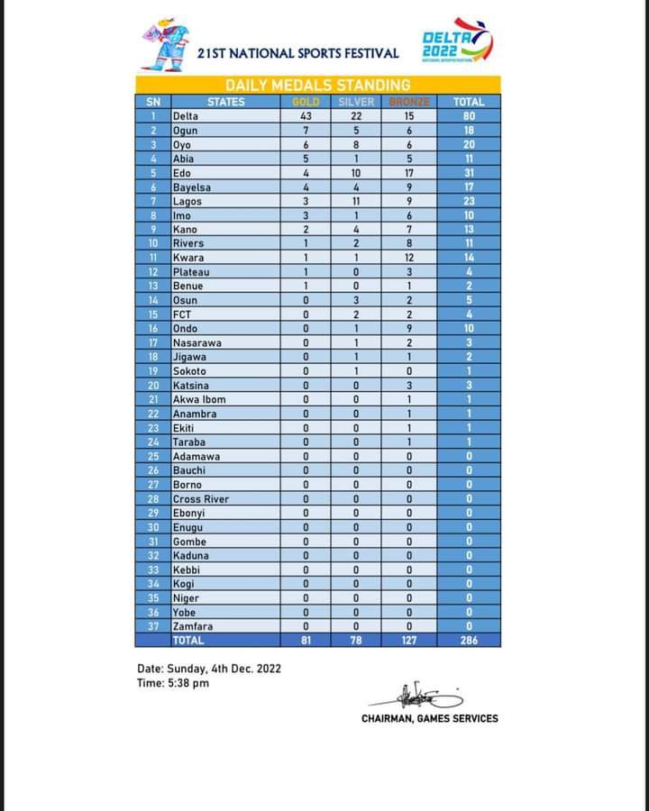 Abia state and Edo are ranked fourth and fifth on the log with 11 and 31 medals respectively.
