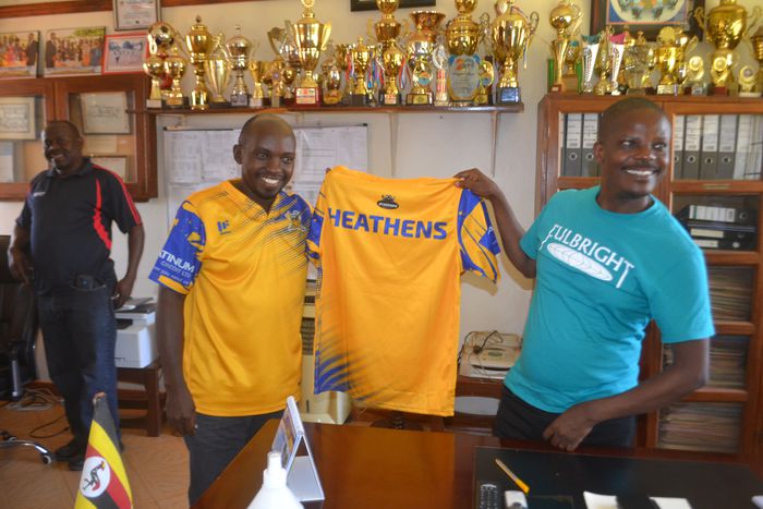 Kyadondo honorary secretary Emma Muhangi hands over Heathens shirt to Jinja SSS head teacher Isaac Balimusangayo after the meeting.