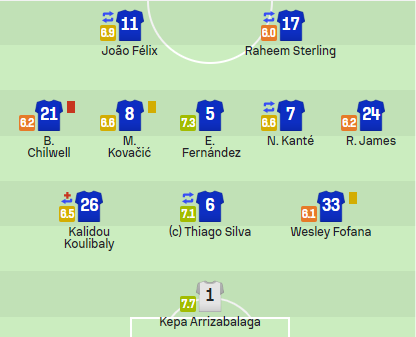A back five of Kalidou Koulibaly, Thiago Silva, Wesley Fofana, Ben Chilwell and Reece James with a midfield trio of Enzo Fernandez, Mateo Kovacic and the excellent Ngolo Kante, leaving Joao Felix and Raheem Sterling as the only attack-minded players on the pitch, which Lampard himself admitted was intentional for counter-attack purposes.