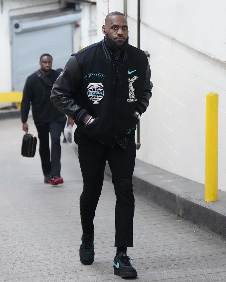 Arriving last night at Madison Square Garden,before the Lakers win against the New York Knicks, LeBron James rocked up in a near-full Tiffany & Co. x Nike apparel fit, including the new Air Force 1 as well as a letterman jacket.