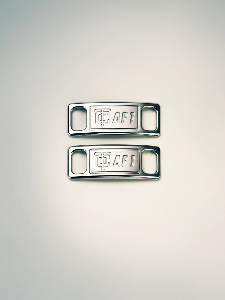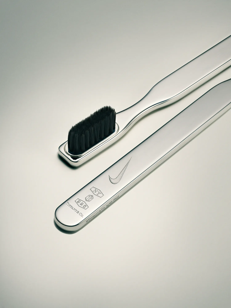 Besides the black suede Air Force1s, which come with sterling silver badges affixed to each heel, there’s an entire kit of sterling sneakerhead essentials, too: a shoe horn, a shoe brush, a whistle, and a dubrae.