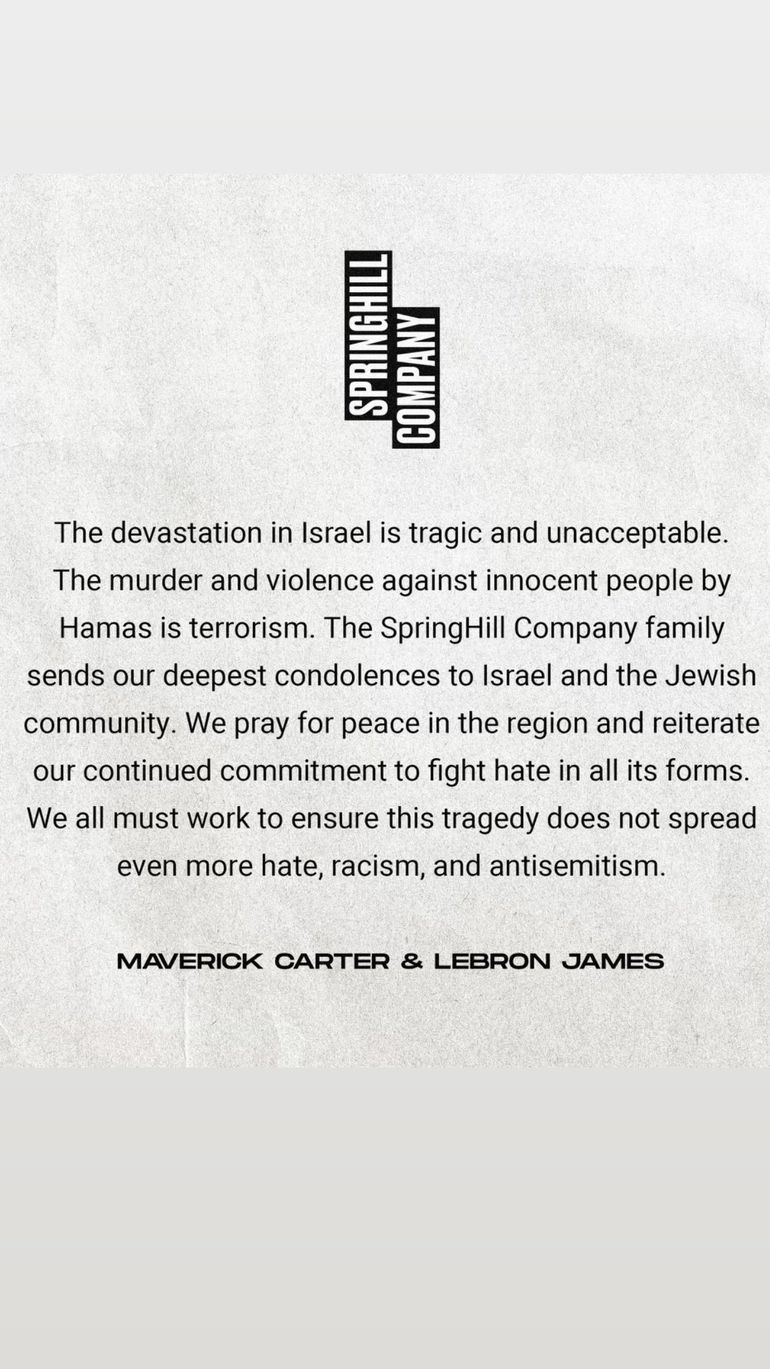 “The devastation in Israel is tragic and unacceptable. The murder and violence against innocent people by Hamas is terrorism.The murder and violence against innocent people by Hamas is terrorism. The SpringHill Company family sends our deepest condolences to Israel and the Jewish community. We pray for peace in the region and reiterate our continued commitment to fight hate in all its forms. We all must work to ensure this tragedy does not spread even more hate, racism, and antisemitism.”