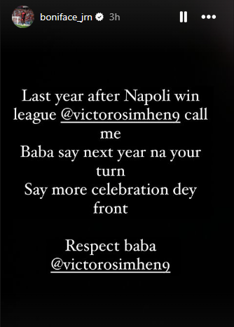 "Last year after Napoli won the league Victor Osimhen called me, baba say next year (2024) na your turn, say more celebration dey front. Respect baba," Boniface wrote.