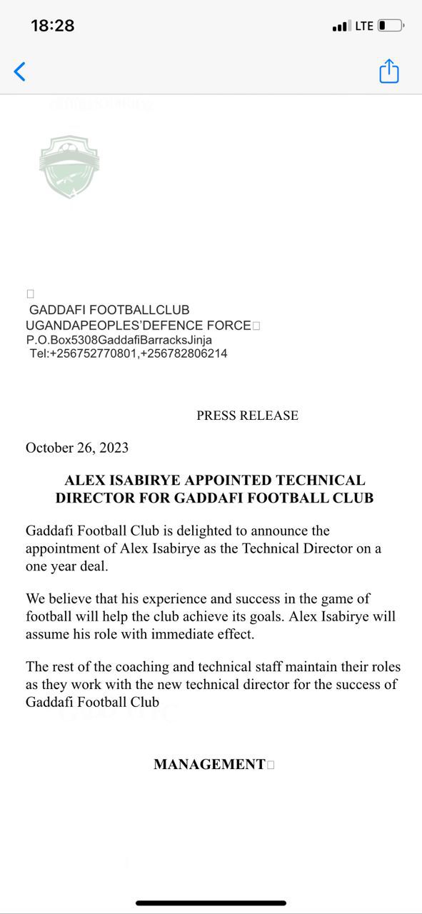 "Gaddafi Football Club is delighted to announce the appointment of Alex Isabirye as the Technical Director on a one-year deal."