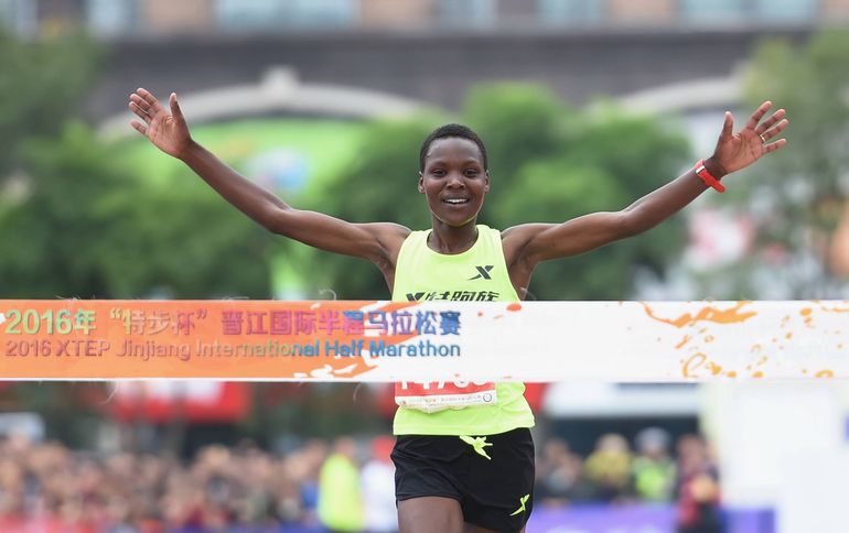 Diana Chemtai Kipyokei of Kenya crosses the finishing line during the 2016 Jinjiang International Half Marathon in Jinjiang City on December 3, 2016.