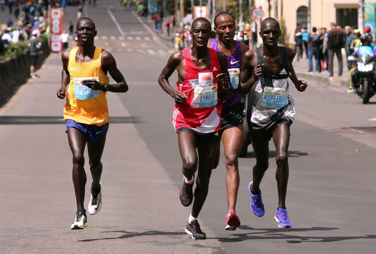 Kenyans Marius Kipserem (L) and Kiprop Limo (2L), the Ethiopian Tadesse Tola (2R) and the Kenyan Kimutai Kiplimo (R) run during the Bogota Half Marathon in Bogota on July 31, 2016.