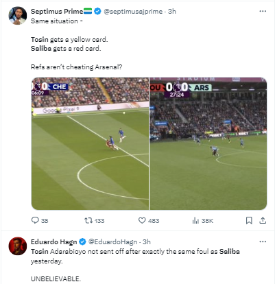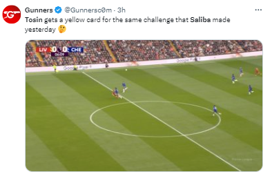 Arsenal fans are furious because Tosin Adarabioyo was not sent off Saliba in Chelsea's loss away to Liverpool.