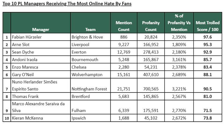 Liverpool's new manager, Arne Slot, has also faced intense scrutiny from fans. Although the Reds are currently in the top two of the Premier League, 9,227 Reddit posts have been dedicated to the Dutch manager, containing over 166,000 profane words.