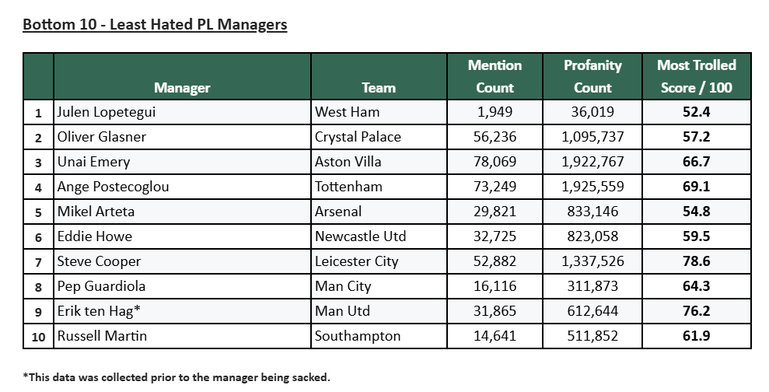 Bottom 10 - Least Hated PL Managers. Data from: Live Football Tickets