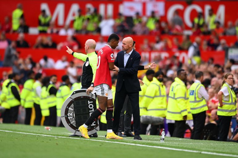 Manchester United's Erik Ten Hag gives instructions to Marcus Rashford during a game.