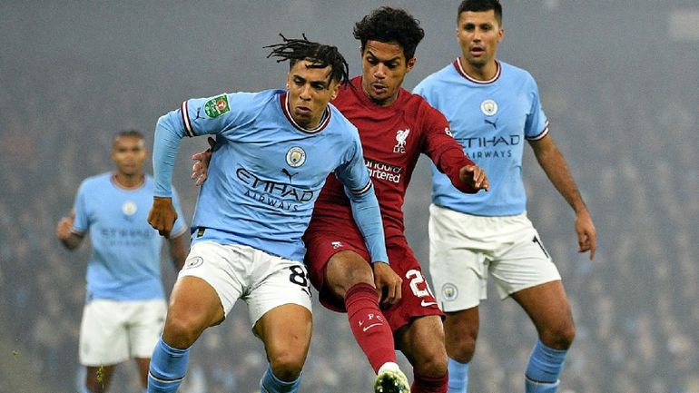 Rico Lewis in action for Manchester City against Liverpool