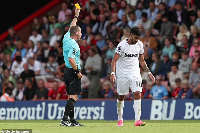 4. West Ham 1-1 Bournemouth (12 August 2023): In the opening game of the season, Paqueta received a yellow card for handball in the 94th minute, with the match ending in a draw.
