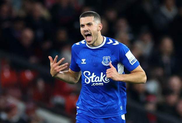 Connor Coady celebrates after scoring for Everton against Manchester United