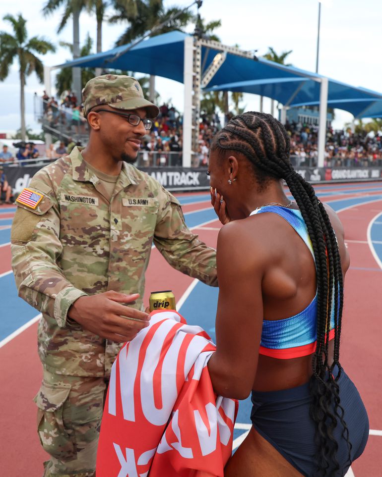 Melissa Jefferson-Wooden: Olympic medallist surprised by cousin serving in the US Army after becoming Grand Slam Track champion